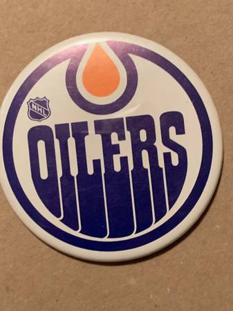 Lot of 7 different NHL Hockey buttons and a pin. Most are in great condition. All are 2.25" in diameter except the Oilers, which is about 3.5":