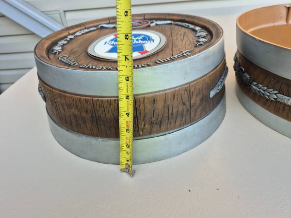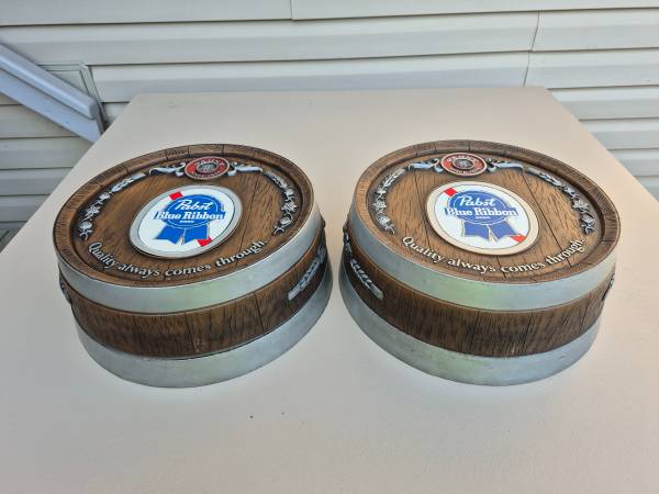 Two 16" diameter wall mount Pabst Blue Ribbon kegs. $50 CASH for the pair!