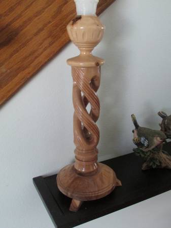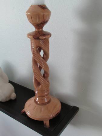One pair of hollow twist olive wood candlesticks from the holy land? They measure 8 3/4 inches tall, they have a 3 inch diameter base, and the body of the sticks is 1 3/8 inch diameter. The dark and light portions of the candlestick give them a mystical feel. They came from a relatives estate so we have no idea of the age or where they were purchased, but family lore was that they were souvenirs of that relatives trip to Israel and Egypt. I have found several similar sticks in prices ranging from $15 to $30 each and you can have both for $27.
