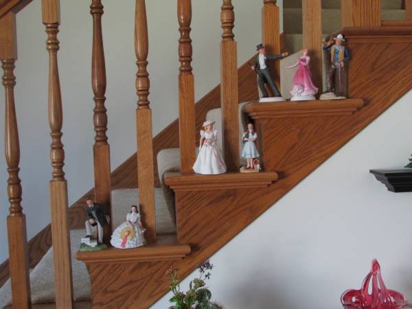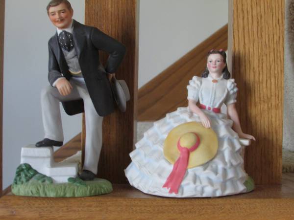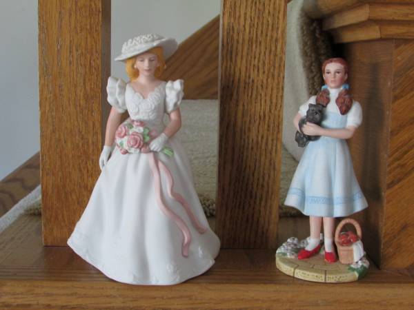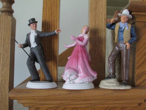 Seven (7) Avon "movie star" porcelain dolls/figurines. These can be purchased individually for $11each or all 7 for $58. They have been kept in a china cabinet and are free from dust and kept out of the suns harmful rays. The photos show them displayed on the ends of a staircase. The John Wayne figurine in western garb is 7.5 inches tall, Ginger Rogers from "Top Hat" is 6 inches tall, Judy Garland and Toto from "The Wizard of Oz" is 5.5 inches tall, Clark Gable from "Gone With The Wind" is 6 inches tall, Vivian Leigh from "Gone With The Wind" is 4.5 inches tall, Fred Astaire from "Top Hat" is 7 inches tall, and the figurine marked "Summer Bride" is 6 inches tall. We will also entertain offers on groups of 2 or more figurines. Thank you for your interest. Just reduced from $16 each and $97 for all 7.