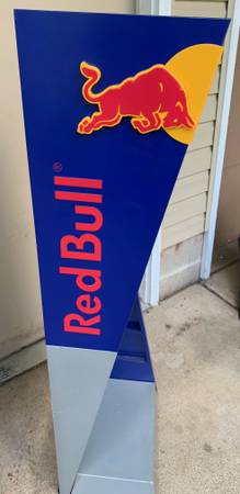 Red Bull Energy Drink metal display. The dimensions are 51.5" high, 16.5" wide, and sticks out 12" It is missing the shelves, but otherwise in good condition. There are 2 wheels on the back for easy movement.