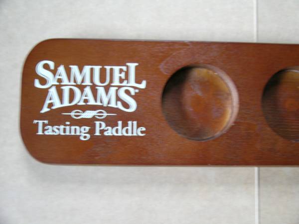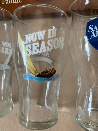 Sam Adams tasting paddle for flights of beer and four glasses. The paddle has some wear on the handle and where the glasses go, but looks pretty good otherwise. Two pint glasses say "Now in Season" and the other two just say Samuel Adams and are a little more heavy duty.