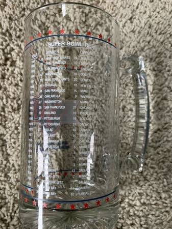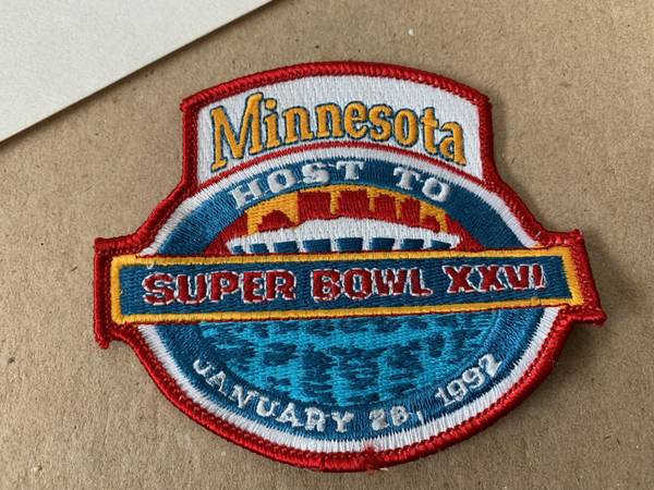 Super Bowl 26 glass beer mug with Super Bowl 1 -25 teams and scores on the back. Also, a Super Bowl 26 pennant. Some wrinkles in the pennant. Also, a patch saying Minnesota Host to Superbowl 26. Also, a key chain This Super Bowl took place at the Metrodome in Minneapolis, Minnesota on January 26th, 1992.