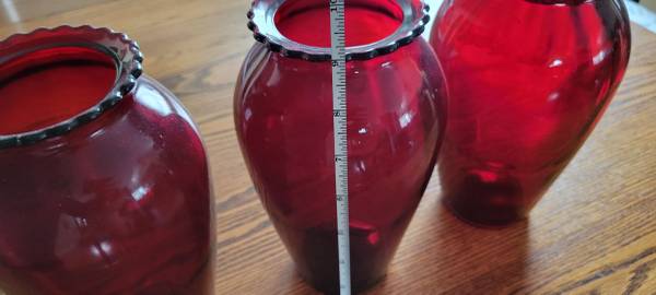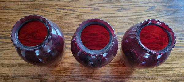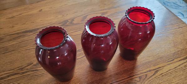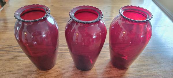 3 Vintage Anchor Hocking Ruby Red Vases. Scalloped edge. About 9 inches tall. $20 each or set of 3 for $50.