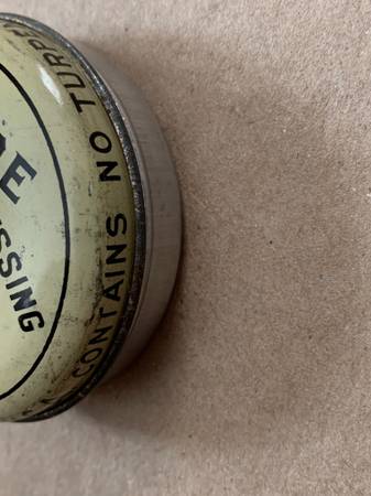 Old shoe polish tin from the 1900's in good condition. SLIDE White Shoe Dressing has a baseball picture on the cover of the tin. In good condition considering its age, but does have some wear especially around the edges.