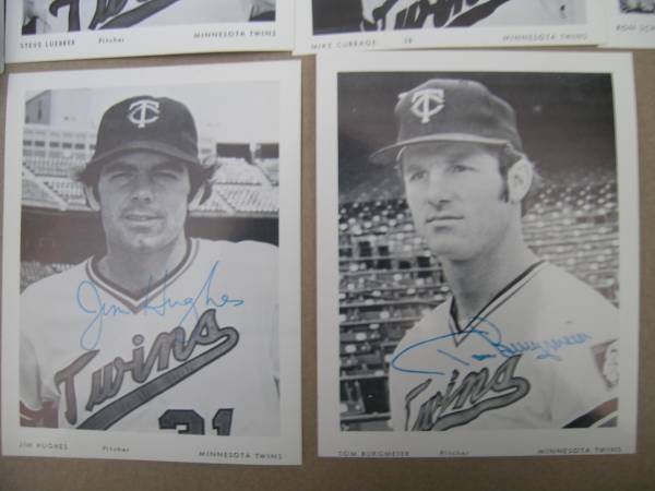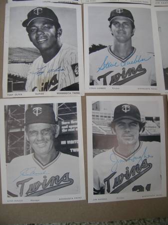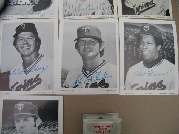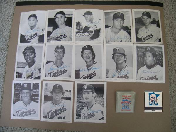 Lot contains a Minnesota Twins metal clip, 15 photos, and a matchbook. The fan appreciation metal clip is not in great condition. Has some marks on the front and some wear marks on the back. Says Twins' Fans Hold "Top Spot" Also contains team issued black and white 4"x5" photos of players from the 1960's with facsimile autographs. The first 9 are not in great condition. Contains the following players: