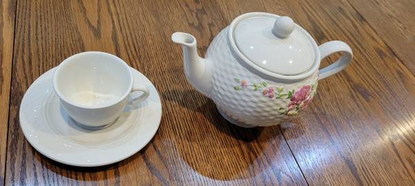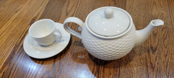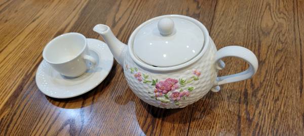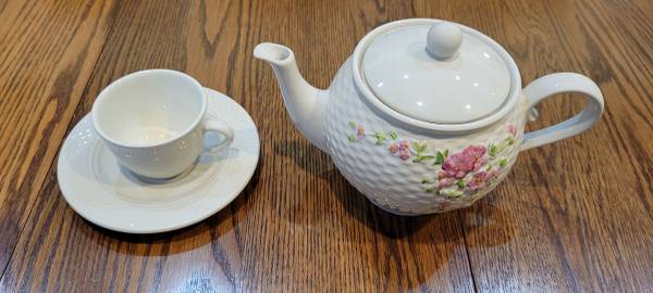 Vintage TELEFLORA Teapot Set. 1985 ceramic teapot and lid, with cup and saucer. Basketweave pattern with pink flowers.
