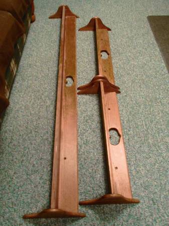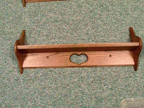 Two each 30 inch long and one 72 inch long oak plate shelves. The vertical end pieces on all three are 12 inches tall to stabilize and support the shelves. All mounting hardware and wood cap plugs are included. We purchased these shelves new for over $350 and the $186 price is for all three. The shelves each protrude out from the wall 5 inches and each has a groove that runs the length of the shelf to hold the plates in place and to prevent tipping or slipping out. We will entertain offers for individual shelves if you only want one or two. The two 30 inch long shelves are identical to each other.