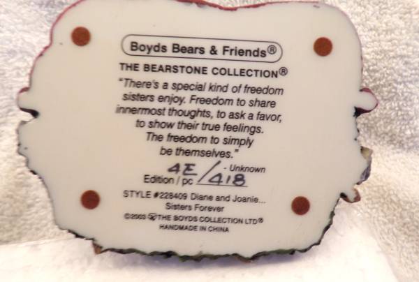 Boyds Bears "Diane & Joanie...Sisters Forever" #228409. Vintage 2003. In original box /original styrofoam packing. Certificate of Authenticity. Original owner, mint condition. 4"H x 4"W x 3"D. Love them, but we are downsizing. Cash only w/pick up Mounds View or Roseville, MN.