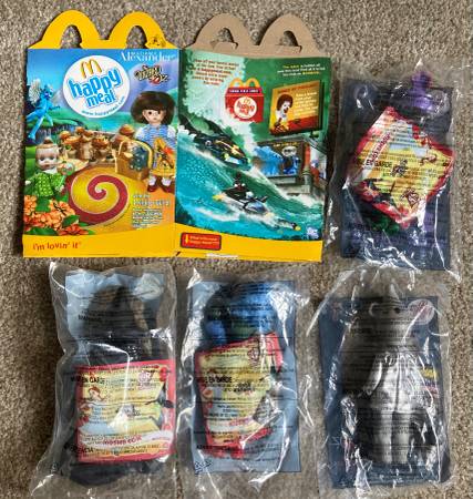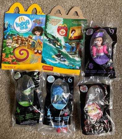 New, unopened, just like they came from McDonald’s back in 2008. New in packages, 4 dolls-tin man, flower munchkin, Winkie guard, and wicked witch of the west. Plus the neat Happy Meal box from release. All 5 items for $10 so averages to $2 per item. Neat 5” dolls for a collector or child to play with. Nonsmoking home with convenient pickup near the Village Inn in Wyoming MN right off interstate 35. Many items listed as we downsize