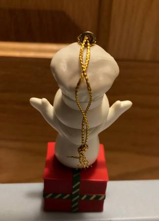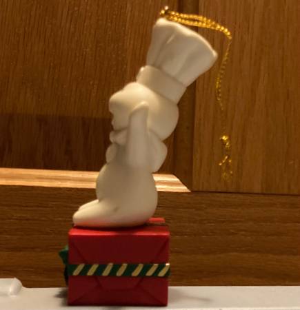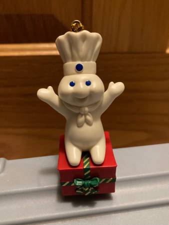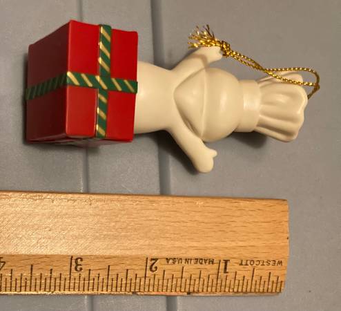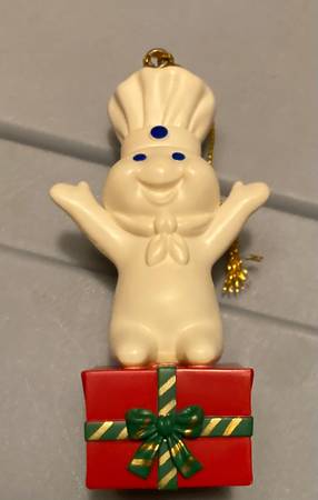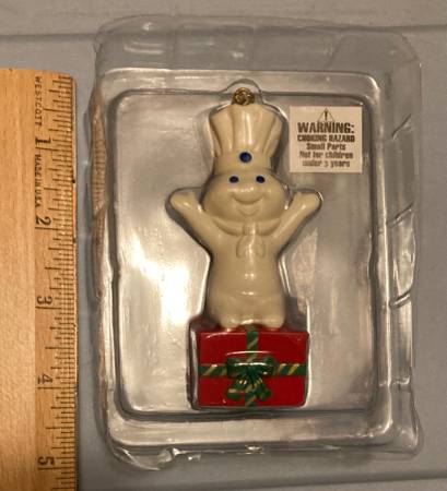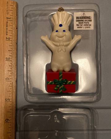 New. Condition shown. Solely removed from package to post. The one corner of the plastic does have a tear in the plastic packaging, and I circled the one spot where the coloring looks off to me. I also circled a spot on his arm which is a bit strange looking but is from the molding process. Cute ornament (around 3.75” tall) with gold hanging string. Pillsbury doughboy on present. pick up near the Village Inn in Wyoming, Minnesota. Non-smoking home with many items listed.