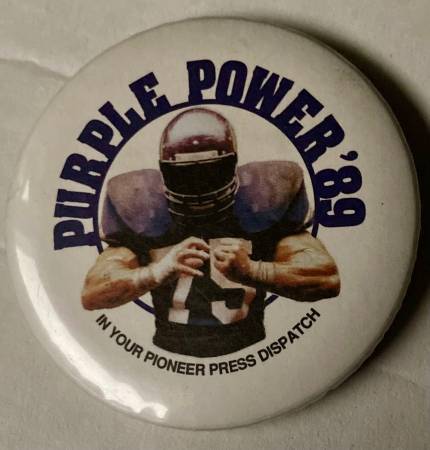 Great condition button for the Minnesota Vikings football team. MN Purple Power 1989 button. Nonsmoking home with convenient pickup near the Village Inn in Wyoming MN right off interstate 35