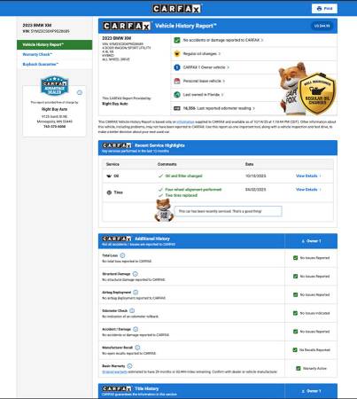 One Owner. Dealer maintained and serviced. Inspection performed. Full remaining factory warranty coverage from BMW. Original MSRP $166,395. This 2023 BMW XM features a 4.4L BMW M Turbo V8 Engine paired with a High-Performance Electric Motor producing a combined 644HP/590TQ. 8-Speed Automatic Transmission. xDrive All-Wheel Drive. Mineral White Metallic Exterior. Sakhir Orange/Black Merino Leather Interior. M Sport Package with Red Calipers. Bowers & Wilkins Diamond Surround Sound System. Extended Merino Leather Upholstery. Heated and Ventilated Front Seats. Heated Rear Seats. Front Massage Seats. Heated Steering Wheel. 4-Zone Automatic Climate Control. Iconic Glow Grille. Wireless Device Charging. BMW Curved Display with iDrive 8. BMW Live Cockpit Pro with Navigation. Head-Up Display with Augmented Reality. Apple CarPlay & Android Auto. BMW ConnectedDrive Services. WiFi Hotspot with Complimentary Data. Shadowline Exterior Trim. Carbon Fiber Interior Trim. 23 M Double Spoke Wheels. Adaptive M Suspension Professional. Active Roll Stabilization. Integral Active Steering. Active Driving Assistant Pro. Extended Traffic Jam Assistant. Surround View with 3D View. Parking Assistant Plus. Ambient Lighting. Panoramic Sky Lounge LED Roof. Soft-Close Automatic Doors. Comfort Access Entry. Power Tailgate. M Performance Exhaust. Every Vehicle at Right Buy comes with a full inspection report. CarFax vehicle history report. Affordable extended coverage options and low-rate financing options. Set an appointment to view the vehicle in our heated indoor showroom.