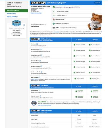 One Owner. Dealer maintained and serviced. Inspection performed. Full remaining factory warranty from BMW. Original MSRP $79,255. This 2024 BMW i4 M50 Gran Coupe features Dual All-Electric Motors producing 536HP/586TQ. Single-Speed Automatic Transmission. xDrive All-Wheel Drive. Black Sapphire Metallic Exterior. Black Vernasca Leather Interior. M Sport Package Pro. Driving Assistance Professional Package. Parking Assistance Package. Premium Package. Shadowline Package. Adaptive M Suspension. Variable Sport Steering. Heated Front & Rear Seats. Heated Steering Wheel. Harman Kardon Surround Sound System. BMW Curved Display with Heads-Up Display. Apple CarPlay & Android Auto. Wireless Device Charging. Icon Adaptive LED Headlights with Laserlight. Dual Zone Automatic Climate Control. Ambient Lighting. Power Front Seats with Driver Memory. Comfort Access Keyless Entry. Extended Shadowline Trim. Anthracite Headliner. 19 Alloy Wheels with Performance Tires. Carbon Fiber Interior Trim. Auto-Dimming Mirrors. Acoustic Protection for Pedestrians. BMW ConnectedDrive Services. Active Guard and Active Driving Assistant Pro. Park Distance Control. Surround View with 3D View. BMW TeleServices. SiriusXM. Power Trunk. Every Vehicle at Right Buy comes with a full inspection report. CarFax vehicle history report. Affordable extended coverage options and low-rate financing options. Set an appointment to view the vehicle in our heated indoor showroom. PRIME LEVEL 3 EXCLUSIONARY COVERAGE AVAILABLE 1 YEAR 12K MILES FOR $2,913 or 5 YEAR 100K MILES FOR $3,903.