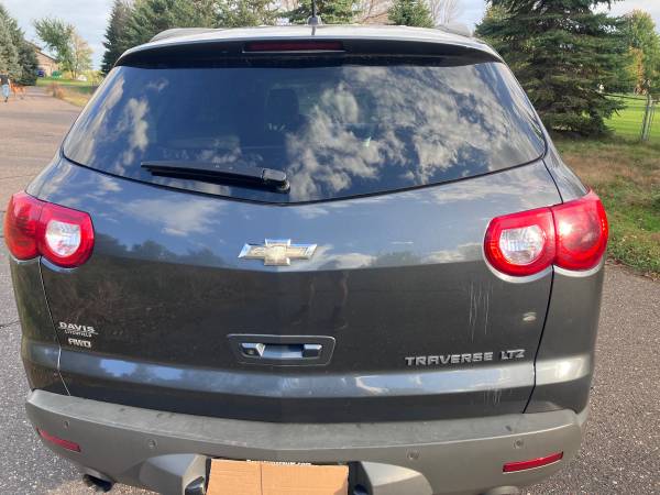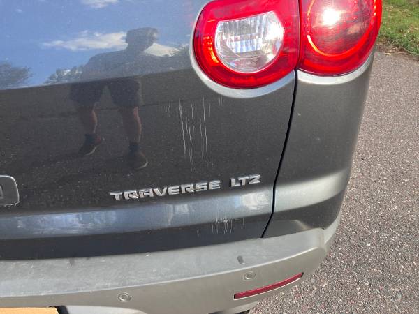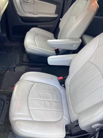 2012 Chevy Traverse LTZ for sale. Fully loaded, good shape inside and out. 195xxx miles. AWD, leather heated and cooled seats, memory power seats, 2nd row bucket seats, tow package, DVD player, backup camera, remote start, like new Goodyear tires, well maintained, recent oil change and new rear brakes.