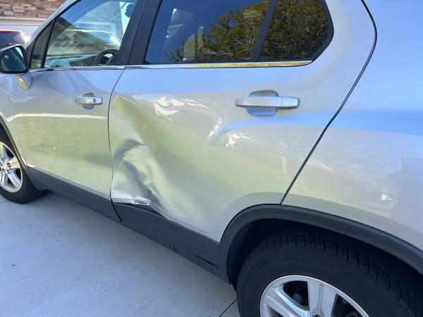 -- Rear, driver-side door has cosmetic damage from being backed into (door works fine, no frame damage). There are other minor exterior, cosmetic marks, as typical for this age of vehicle.