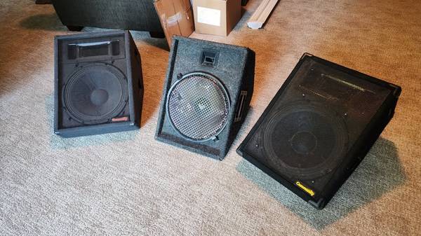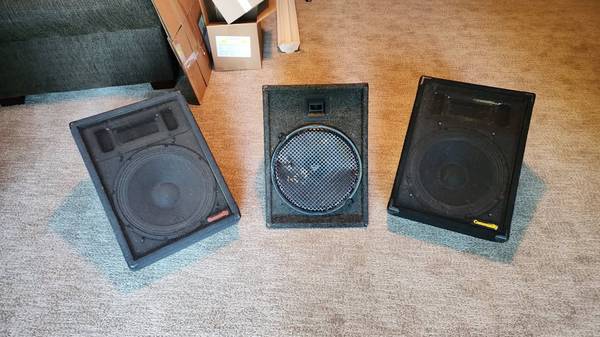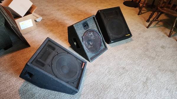 These are 2 Community 15" monitors, and 1 Cerwin-Vega 15" monitor. The Cerwin-Vega is older than the Community's. All three work fine, all speakers and horns are good to go.