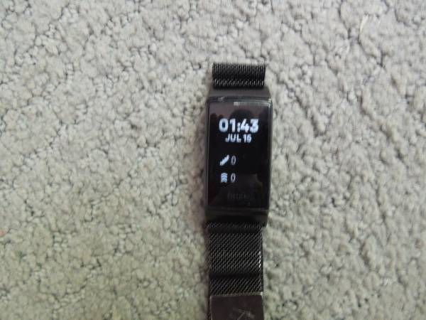 Used Fitbit Charge 4. Comes with black metal band with magnet to close. Also has a spare gray plastic band and 4 chargers. The face does have some scratches on it, but that doesn't impact the readability of the watch. Battery is still good, roughly 7 days between charges. Let me know if you have any questions.