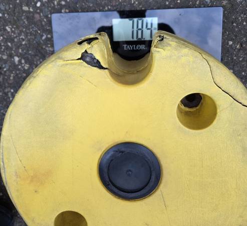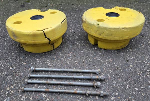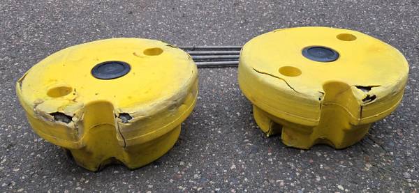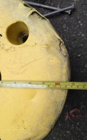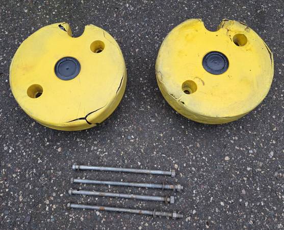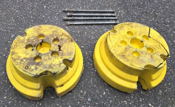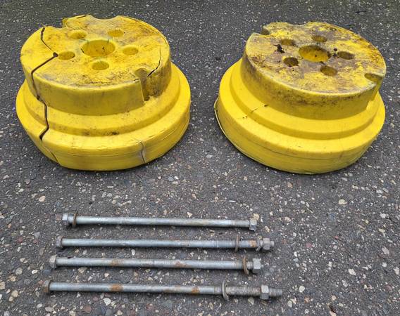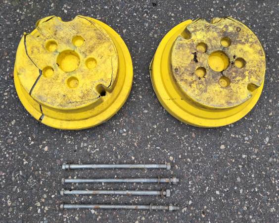 For Sale: John Deere 78.5lb Wheel Weights and 4-Bolts for Tractor with Plow or Snow Blower Attachment Each wheel weight is about 78.5 pounds, for a total of 157 pounds. There are also 4 Bolts for...