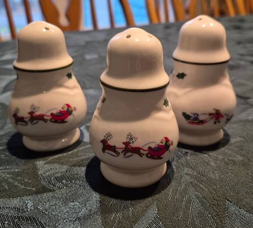 Snow Village Collection, salt and pepper shakers. Set of 3. 4 inches tall. Stoneware.