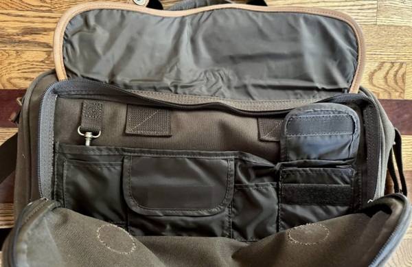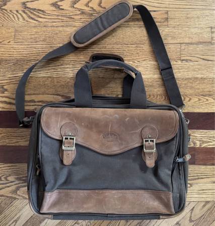 This Cabela's Messenger Bag is made of a combination of sturdy leather and durable canvas, featuring a stylish solid brown color with brass hardware accents. It is designed for business and school use, with a spacious medium/large size perfect for carrying a laptop or computer. The bag has multiple pockets, inner dividers, and a laptop sleeve for organization, along with a removable pouch and adjustable straps for versatility. With a mix of canvas and nylon lining, this unisex bag offers a blend of functionality and classic design suitable for various occasions