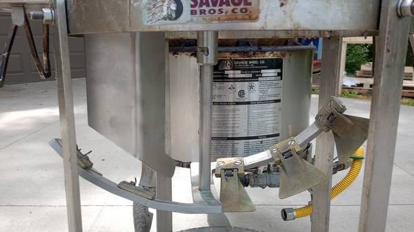 Used Savage Brothers gas stove, model 20B, 80000 BTU HR, manufactures in 2009, copper kettle 20' wide x 12" high, agitator 1 phase, model 1803 and a dolly. Coffee shop, bakery, candy chocolate shop,...