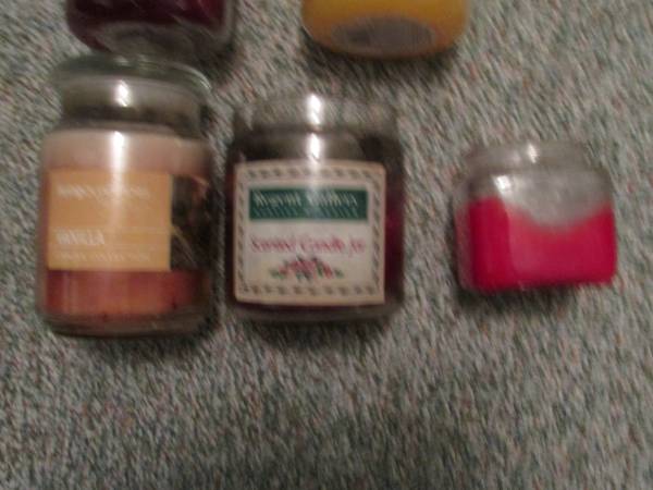Two (2) Yankee candles with lids. Apple Cider that has been lit but is only down about 1/4 inch from new and Banana Cream Pie "Housewarmer" that has only made a small indent around the wick. The Apple Cider candle has a $25 price tag on the bottom. One Living Quarters Vanilla candle with a lid that has been burnt down about 1 1/2 inches and the price on the bottom label is $20. One Regent Gallery candle without a lid that the bottom label identifies as Burgundy/Cherry that has been burnt about 75 to 80%. All four of these candle jars are round from 3 1/2 to 4 inches diameter. The small square candle is marked Empire Strawberry and is about 1/2 gone. If you only want part of them we would pair the two red or the two yellow large jar candles for $5.00 per pair. and the small square red candle for $1.50.