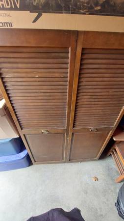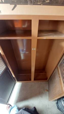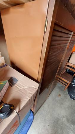 Large metal storage cabinet with 2 wooden magnetic closure doors. No wheels or lock. Best for storage in a garage or basement area (was used for storing life jackets and misc fishing items). Small rust hole in the bottom of cabinet as seen in picture.