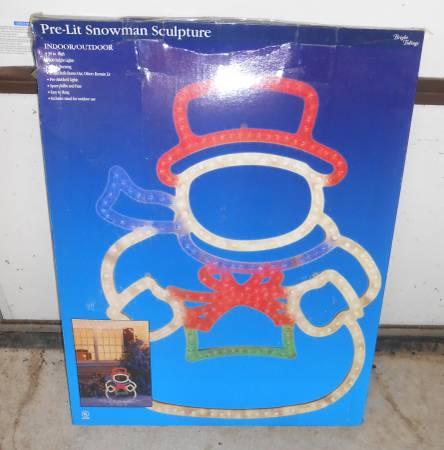 New in the box, pre-lit snowman sculpture 30" high, 300 lights, hang up or use included stand for yard. Asking 10.00