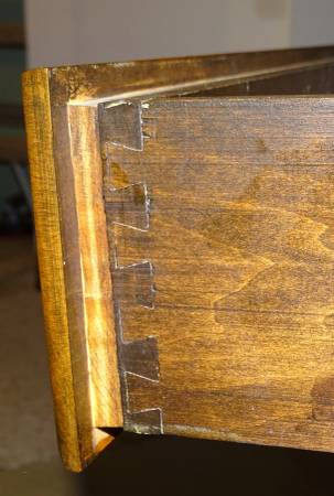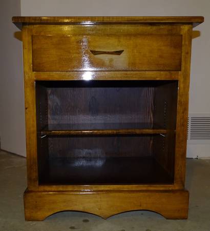 ESTATE SALE! The nightstand is custom built. It features solid hard maple top, sides, face frame, bottom moulding, drawer front and the shelf is tipped with hard maple. The adjustable shelf has counter sunk metal shelf standards and the drawer has dovetailed sides. The nightstands finish has 3 coats of sealer, 3 coats of royal finish and 2 coats of rubbing oil using pumice as the polishing agent. Cash only please.