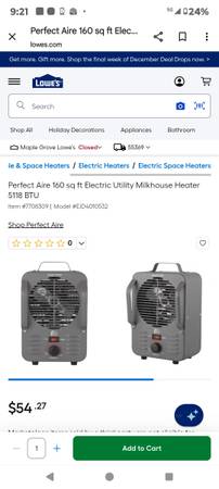 Perfect Aire 12 inch Forced Air Electric Utility Heater, 2 Heat Settings 750/1500watt, All Metal And Durable, Thermostat Controlled, Fan Only And Anti Freeze Functions, Up To 200 sqft Space, Perfect For Basement Utility Room, Workshop, Shed, Chicken Coops, Office, etc. Brand New, Never Used, Comes With Owners Manual, Warranty Papers, Display Model.
