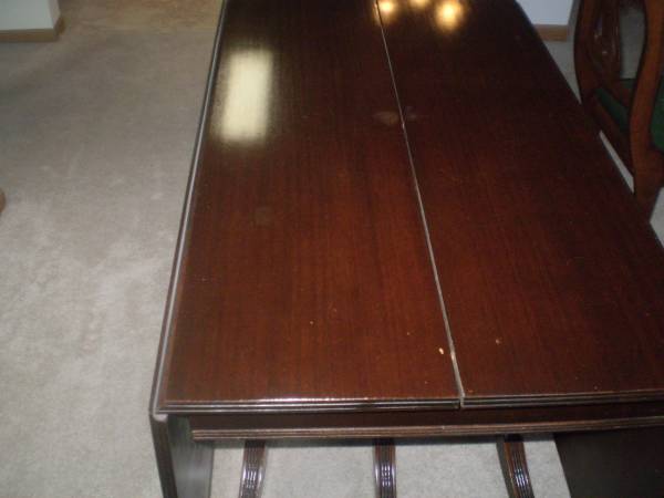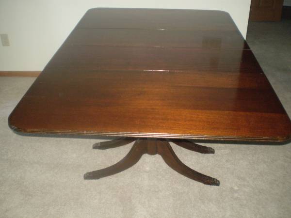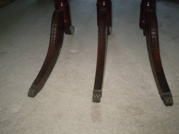 Duncan Phyfe Mahogany 3 leg dining room table with 4 harp back chairs. 3 armless chairs,1 arm chair .Also includes 2 leaves and table top pads. Custom needle point on chair pads.