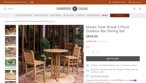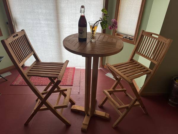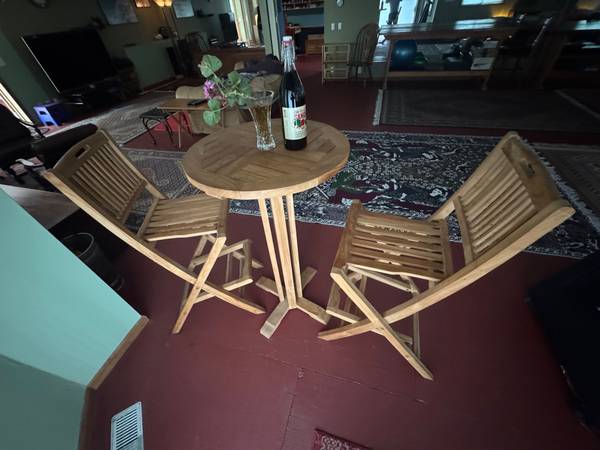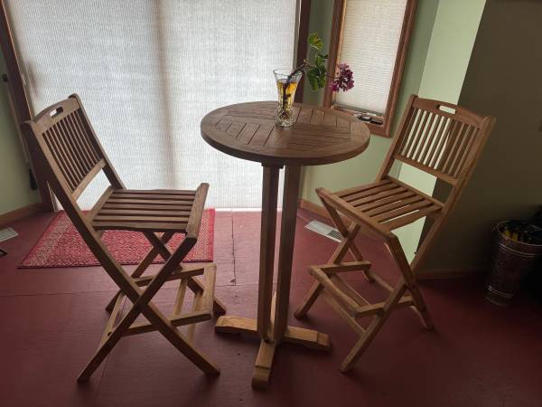 For sale is a basically new 3 piece Teak Table and Chair bistro set. This set was purchased for a location that ended up not being used. The chairs are foldable for easy storage when not needed. Similar items online are anywhere from $900 to over $1200 (see pictures from Cambridge Casual and Home Depot). Great for home bar area or for patios.