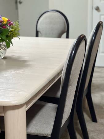 Each of the six chairs is solid and sturdy, upholstered with a lovely neutral tone chenille upholstery fabric, and stained with GF water-based Onyx stain, which is a black stain with brown undertones.