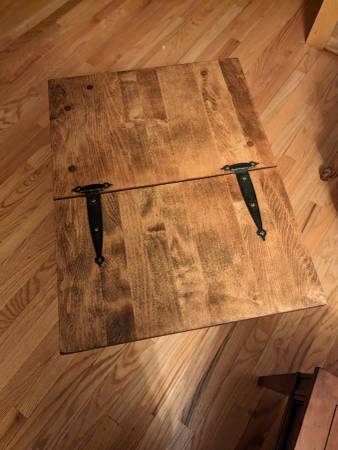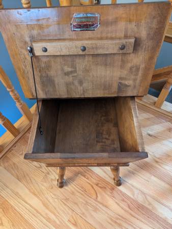 VINTAGE MAPLE DOUGHBOX END TABLE BLACK HINGED DOOR HALF OPENS FOR STORAGE GEORGE B. BENT VERY GOOD CONDITION BEAUTIFUL MID-CENTURY TABLE 17X22-1/2 21-1/2", TALL $50 CASH ONLY BEAUTIFUL TABLE TXT IF...