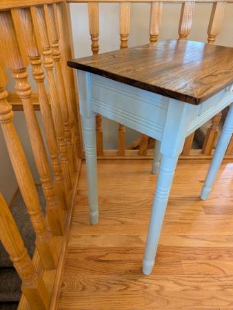 VINTAGE ENTRY TALL FARMHOUSE/CONSOLE TABLE PAINTED BLUE OLD WOOD TOP ONE OF A KIND IT'S AN OLD PIECE VERY SOLID 16 LONG 22 WIDE 28-1/2 TALL $40 CASH ONLY TXT OR EMAIL IF INTERESTED I LIVE IN ANDOVER...