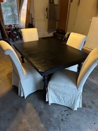 Hello I’m selling my dining set. Table is gorgeous, a lot of character and over 100 years old. I bought it at an estate sale in southern MN. It has been painted black and I want to sand it down and refinish but I don’t have the time. It could use some TLC but structurally solid and very heavy. Triple pedestal base. The chairs are from Gabberts and in great condition. No rips or stains and sturdy. Please call or text if interested. Thanks! Danny show contact info