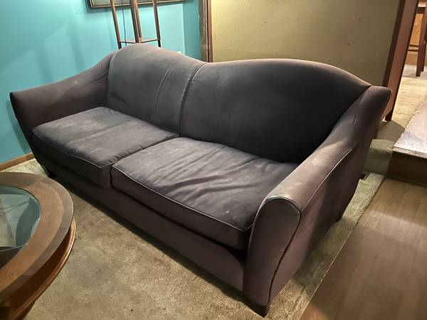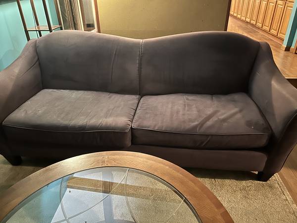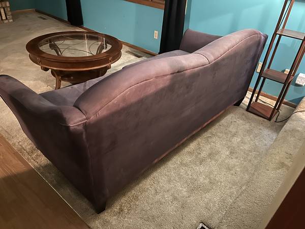 Purple couch approximately 10 years old. Decent shape because it was always used with a cover, so less wear and tear on the upholstery.