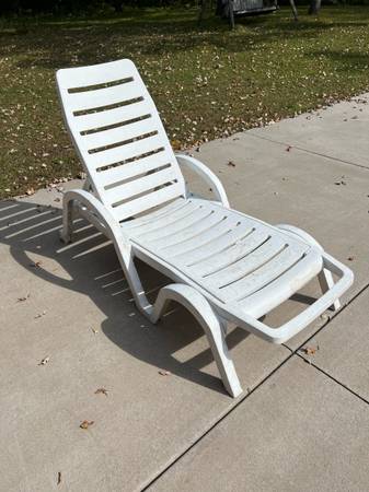 Plastic chaise lounge with rear wheels for easy moving around. Back adjusts in multiple positions.