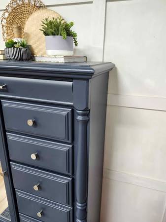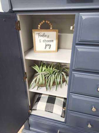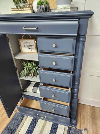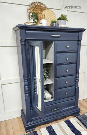Brighten up your space and add a lot of storage with this wood armoire. It has been refinished in a denim blue with silver hardware. A mirrored door opens to 2 shelves. Seven wood drawers glide easily on center tracks. Fully sealed with protective poly.