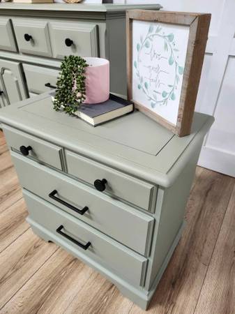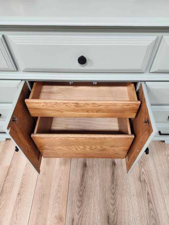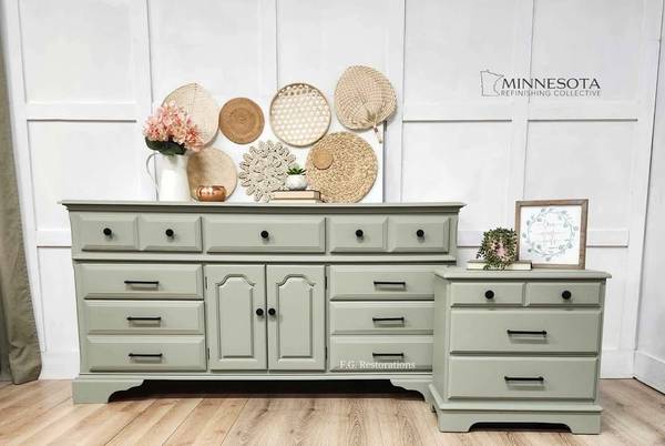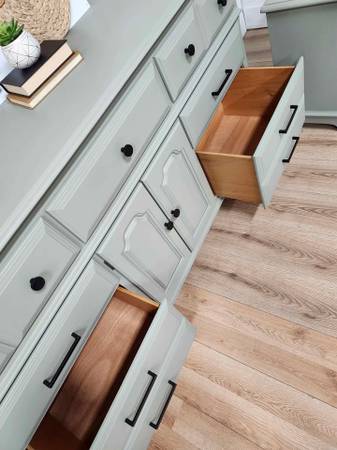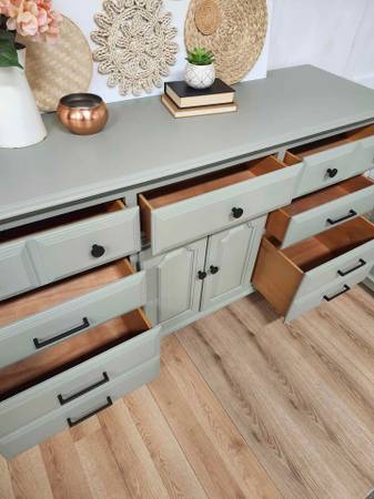 Excellent long dresser by Cochrane Furniture refinished in sage green with black hardware. (Silver or gold available). The 9 dovetailed wood drawers glide well. Bottom row is double deep, great for max storage.