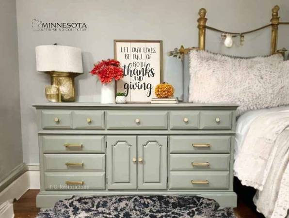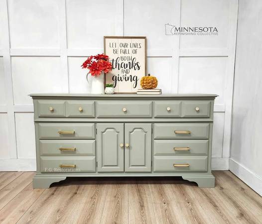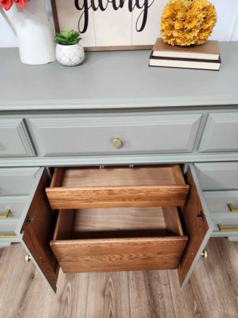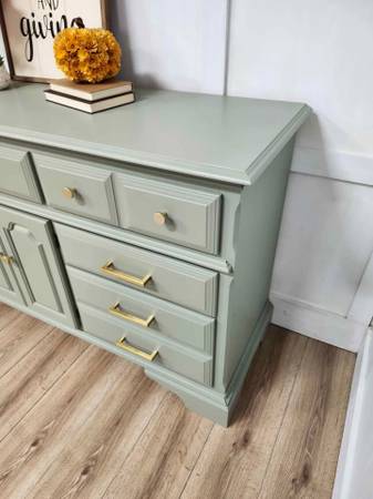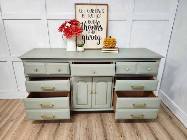 Excellent long dresser by Cochrane Furniture refinished in sage green with gold hardware. (Silver or black available). There are 9 gorgeous dovetailed wood drawers. Inside the double doors are 2 drawers. The bottom row is double deep.