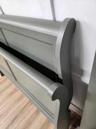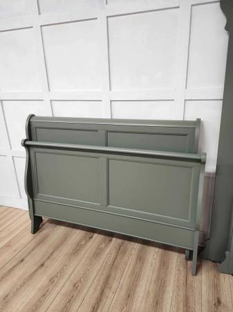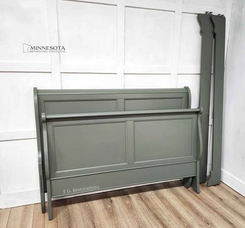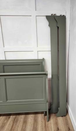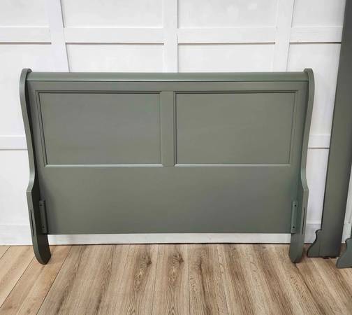 It has been refinished in an olive green and sealed with protective poly. Flat panels in both headboard and footboard with curved top and sides.