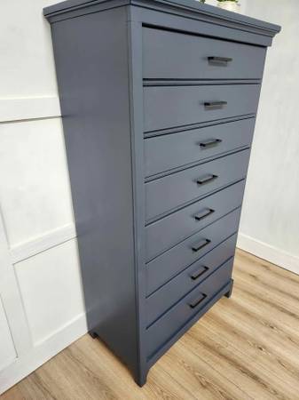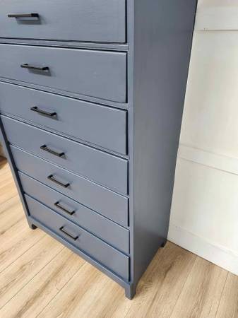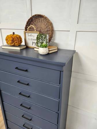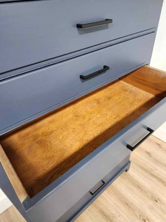 Never have we ever come across a dresser this tall with all drawers! It has been refinished in a blue with black hardware. (Silver or gold available). It has some character and mystery. The right side trim once folded over all the drawers and locked! Now for its next life all the 8 drawers are easily accessible. They are solid wood drawers that glide on side rails as it is an older piece. Feet elevate this off the floor.