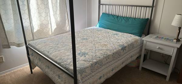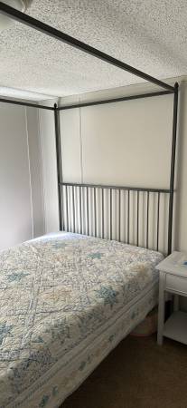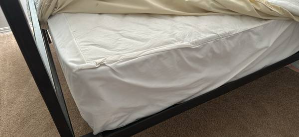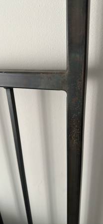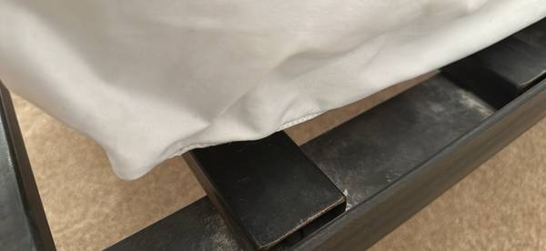 Steel slats, platform style, disassembled for pick up. Vintage, stylish, heavy duty, metal bed frame and mattress from Original Mattress Factory has always been in protective cover.