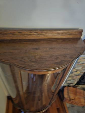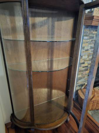 This is a lovely antique currio cabinet with 3 glass shelves. The cabinet is way too fragile to withstand my pets and kids. The cabinet looks very nice but is top heavy and should probably be anchored to the wall and I think the legs need to be tightened. There are amazing ideas on Pinterest for refinishing these. Fcfs pick up only.