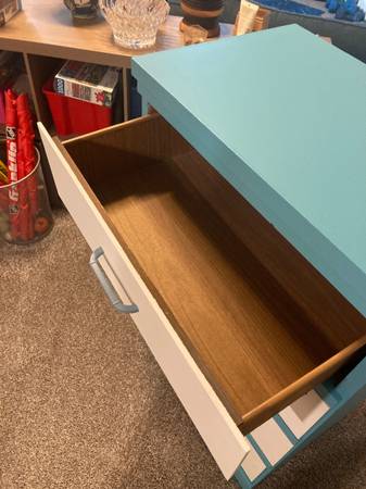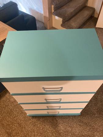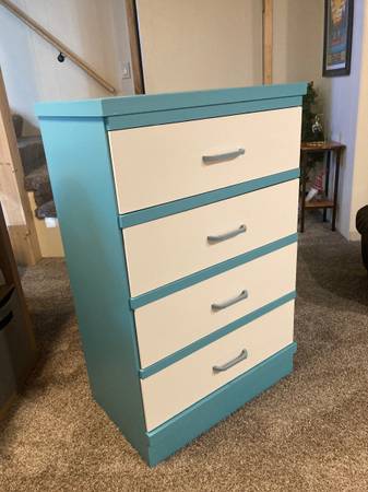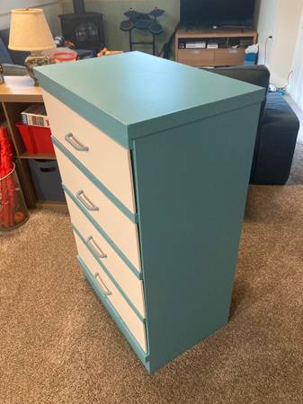 Four drawer dresser painted blue with white drawers. Freshly painted and repaired a board. Lightweight yet sturdy. Measures 41 in tall 26 in wide 17 inches deep