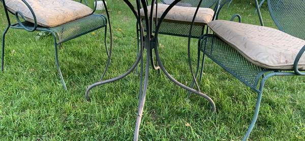 Outdoor patio table in a sage green. Sturdy 42” Pick up in East Bethel! Delivery available. Porch patio deck lawn chipped paint and rust present. $40