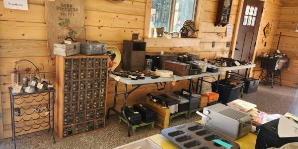 Aladdin lamps, Jim Beam decanters (cars and trains), Red Wing pottery, Harley Davidson apparel and accessories, tons of adult clothing, Coach purses, Coca Cola items, metal signs, nutting warehouse cart, post office boxes, lightning rods, Radio Flyer wagon, stainless steel silverware set, metal military boxes, vintage scales, rat rod rust, oak dresser, lots of galvanized items, cast iron, barn lanterns, hunting & fishing equipment, 1955 Chevrolet auto parts, pitchforks, axes, shovels, oil cans, buckets, tools, art, DVDs, Halloween fun, Christmas items, kitchenware, dishes, glassware, antiques, collectibles, jewelry, lots of fun rusty stuff, and way more than you can imagine!