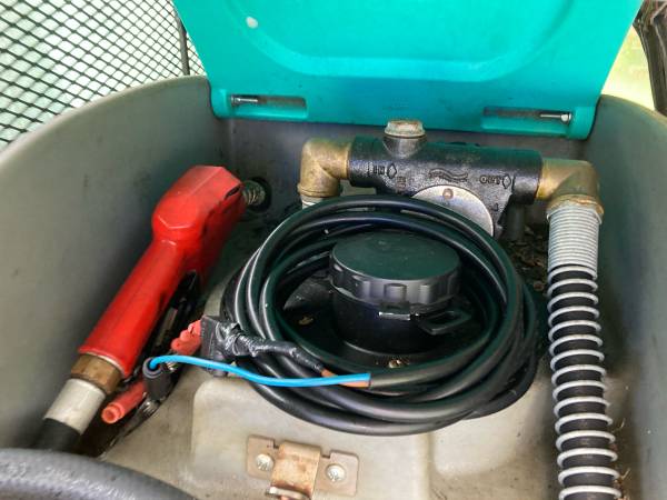 Enduraplas 80 gallon portable diesel fuel storage tank with 12v pump, 20’ hose and auto shutoff nozzle. fits in the back of pick up truck clamps onto your vehicle or separate battery or vehicle 12v power to run pump, works great. Retired no longer need it.